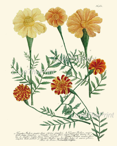 BOTANICAL PRINT Art Print W2 Beautiful Antique Marigolds Orange Flowers Illustration Plate to Frame Home Room Wall Hanging Picture