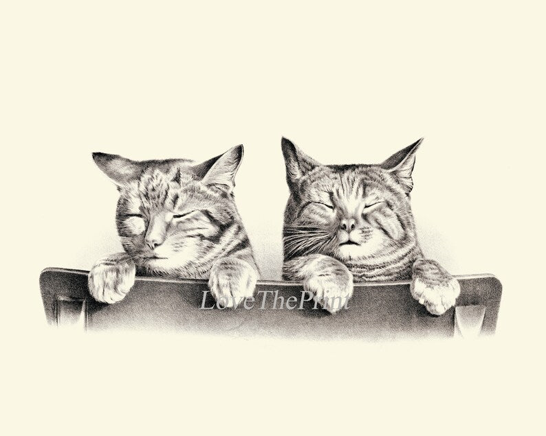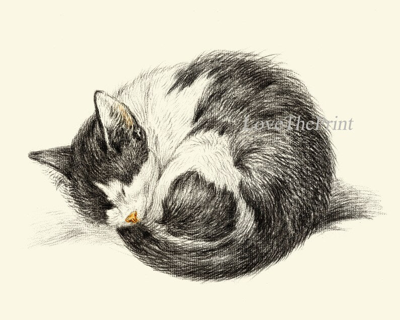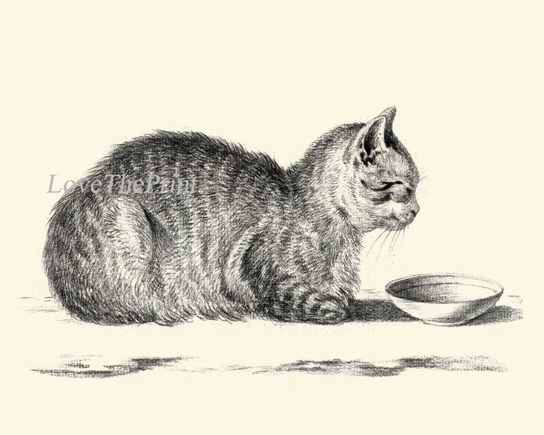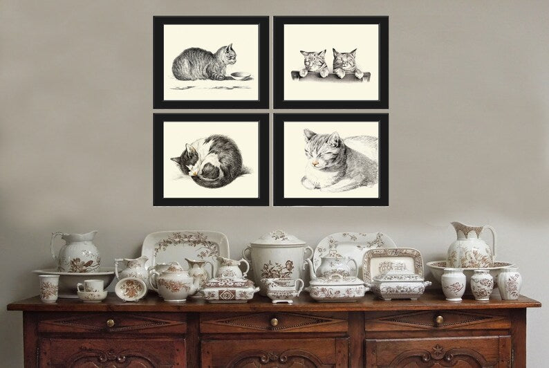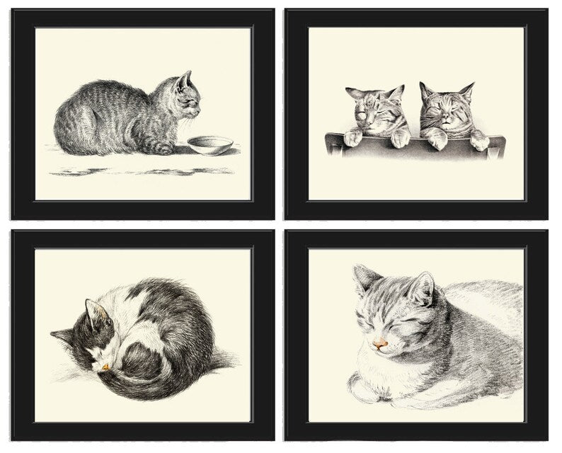 Cat Illustration Drawing Wall Art Print Set of 4 Beautiful Antique Vintage Kitty Kitten Cute Pet Animal Picture Home Room Decor to Frame JB